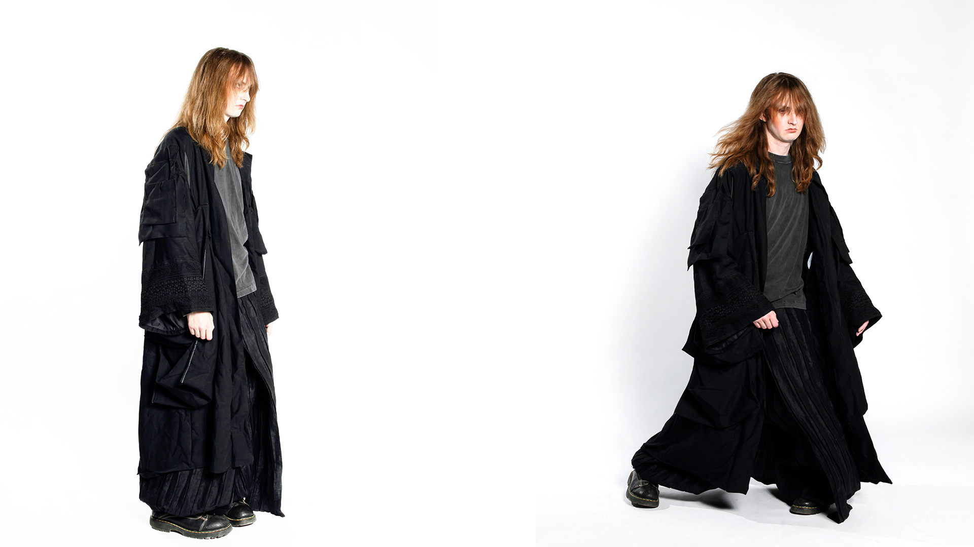 Deconstructed coat & box-pleated pintuck pants draped over the course of six weeks as thesis for my draping course. I was inspired by visible construction and the intersection of military and gothic aesthetics.